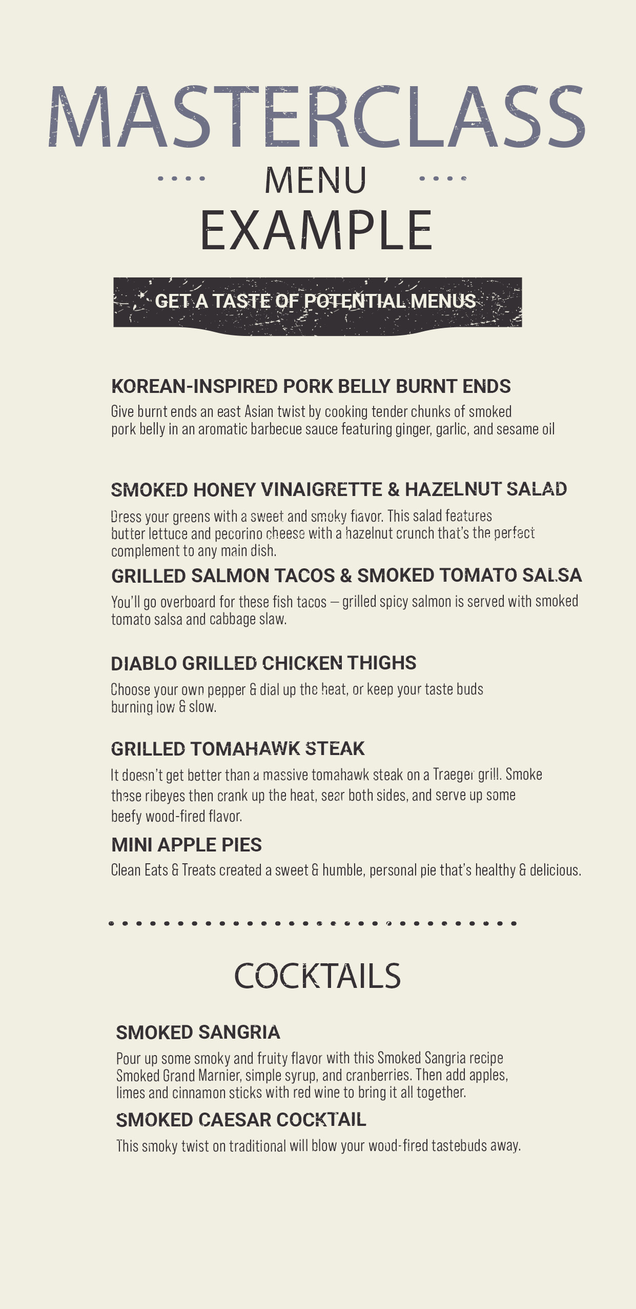 In this immersive experience, attendees will learn the ins and outs of cooking a diverse and mouthwatering menu. Ranging from culinary delights, classic BBQ favorites, to signature smoked cocktails. Our expert pit master will guide participants through a full multi-course meal. From preparing appetizers to crafting side dishes & creating succulent main courses.
